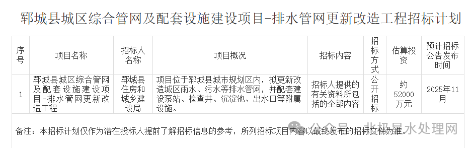 項目概況:項目位于鄆城縣城市規(guī)劃區(qū)內(nèi),擬更新改造城區(qū)雨水、污水等排水管網(wǎng),并配套建設(shè)泵站、檢查井、沉淀池、出水口等附屬設(shè)施。