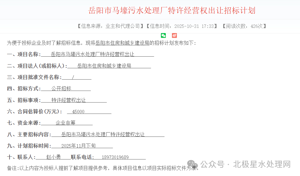 岳陽市馬壕污水處理廠特許經(jīng)營權(quán)出讓