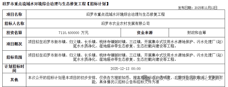 汨羅市重點(diǎn)流域水環(huán)境綜合治理與生態(tài)修復(fù)工程